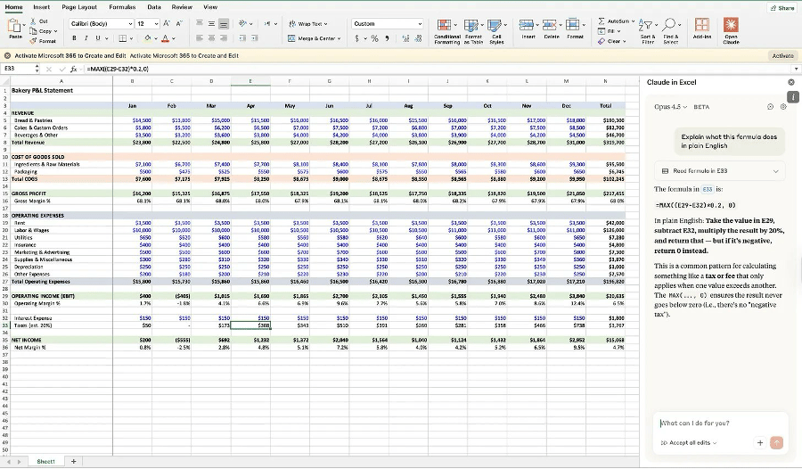 Check out this real example. A bakery P&L. Cell E33 has this formula: